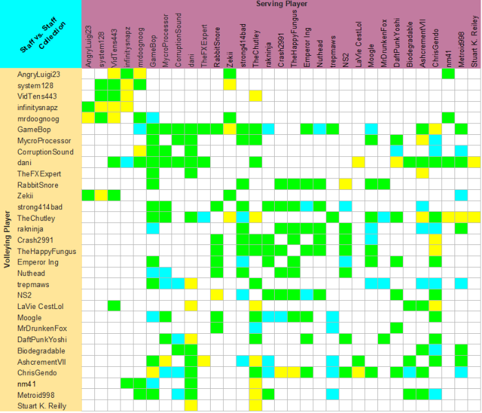 All tennis matches between tennis staff, as of October 1st, 2024 Green = complete Yellow = in progress/incomplete Blue = Present in multiway/direct volley in chain match